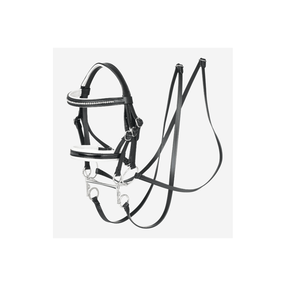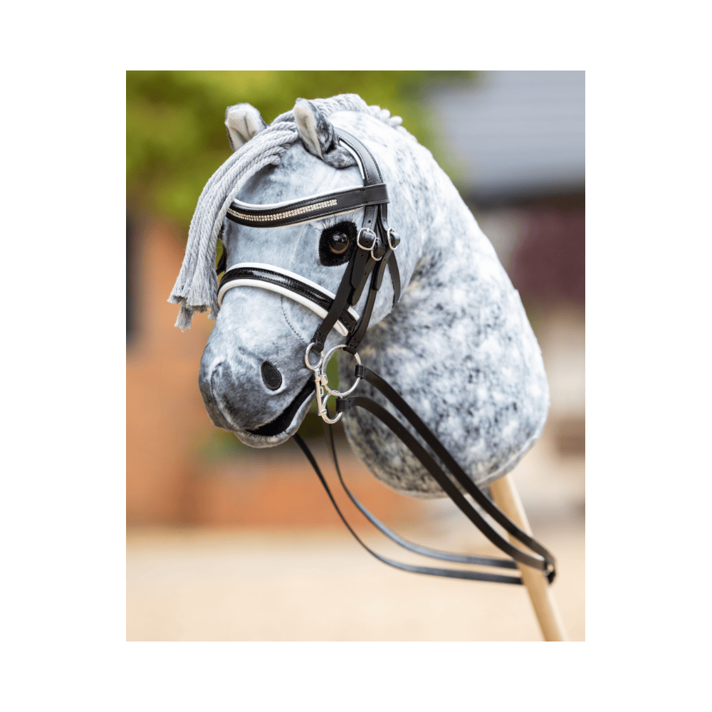 Un élégant frontal rembourré en cristal donne le look LeMieux, tandis qu'une muserolle rembourrée en cuir blanc souple et en cuir verni noir confère une apparence de dressage authentique.