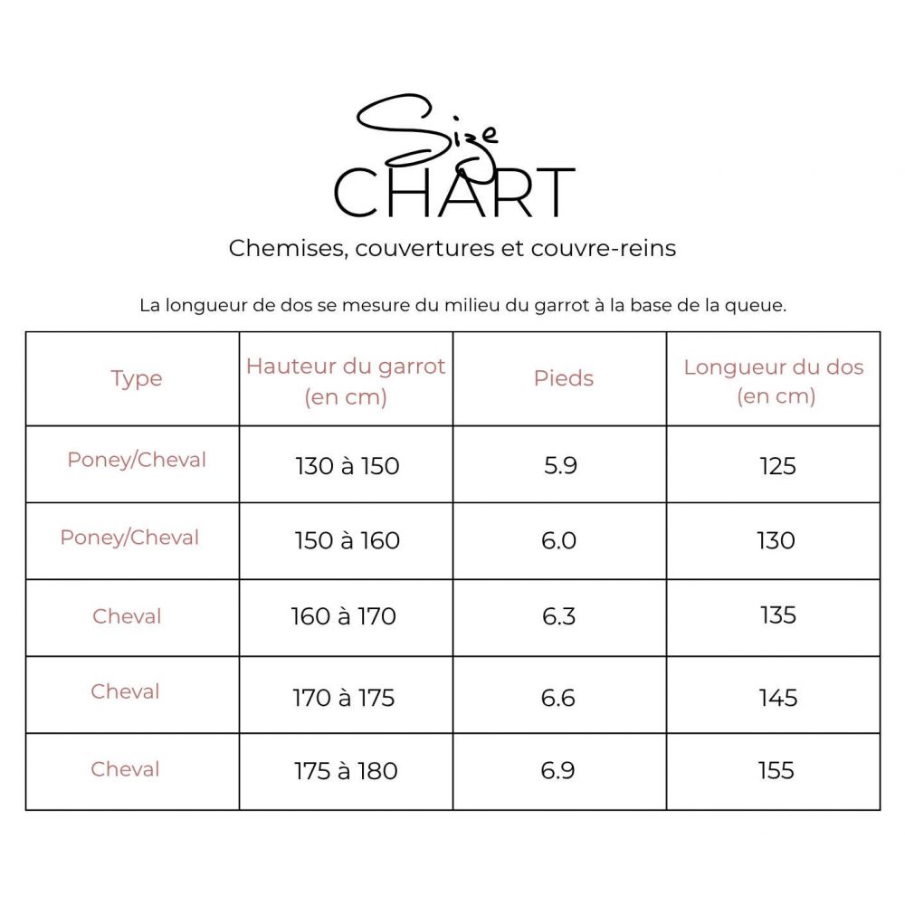 Ce guide de tailles souhaite être le plus précis possible. Néanmoins, nous attirons votre attention sur le fait que chaque cheval est unique, que certaines morphologies peuvent présenter des particularités. Tous les chevaux ne peuvent pas obligatoirement rentrer dans les cases de ce tableau. Quoiqu’il en soit, nous restons à votre écoute pour vous aider à trouver la taille parfaite et à vous satisfaire pleinement.