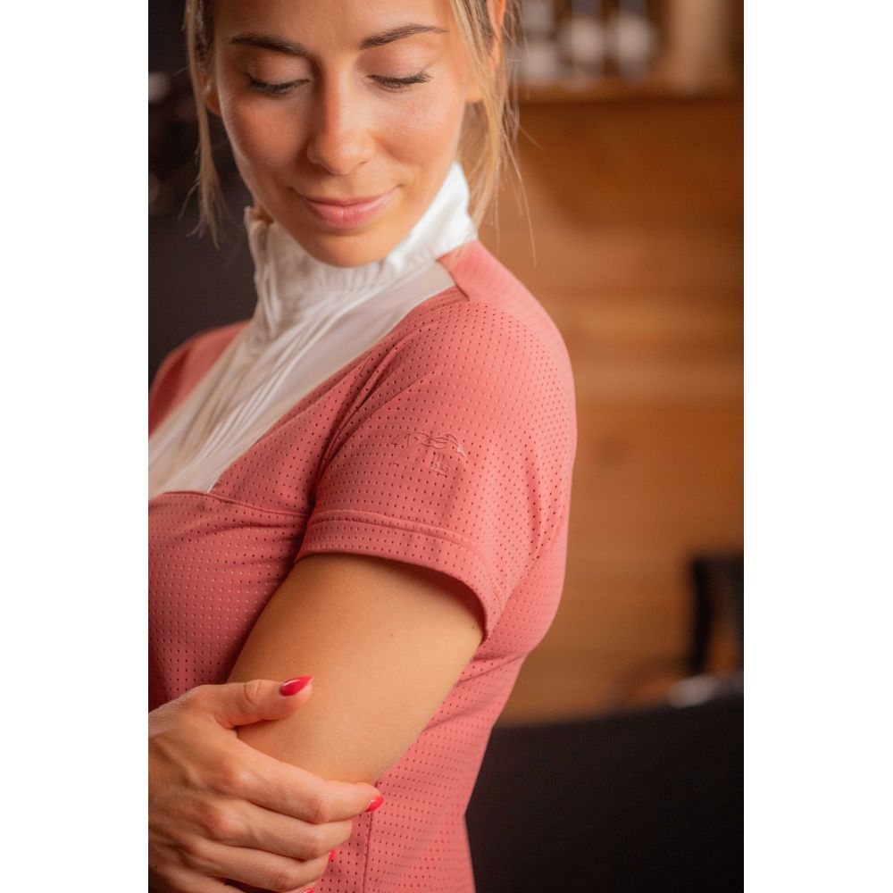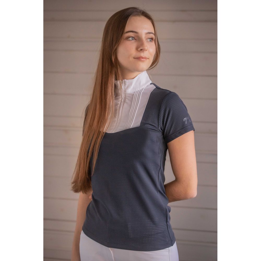 Polo de concours Florence des collections Pénélope à manches courtes confectionné dans un tissu micro aéré. Il a un col officier avec un petit zip caché, un plastron blanc strié et une jolie fronce sur le devant.