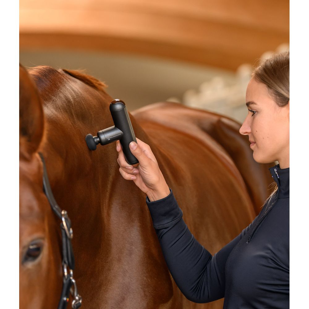 Dieses praktische Massagegerät wurde speziell für die Anwendung bei Pferden entwickelt. Mit 4 austauschbaren Silikonaufsätzen und 5 individuell wählbaren Vibrationsstufen (1800/2100/2400/2700/3000 U/min) kann die Massage optimal auf die verschiedenen Muskelpartien und Empfindlichkeiten abgestimmt werden.