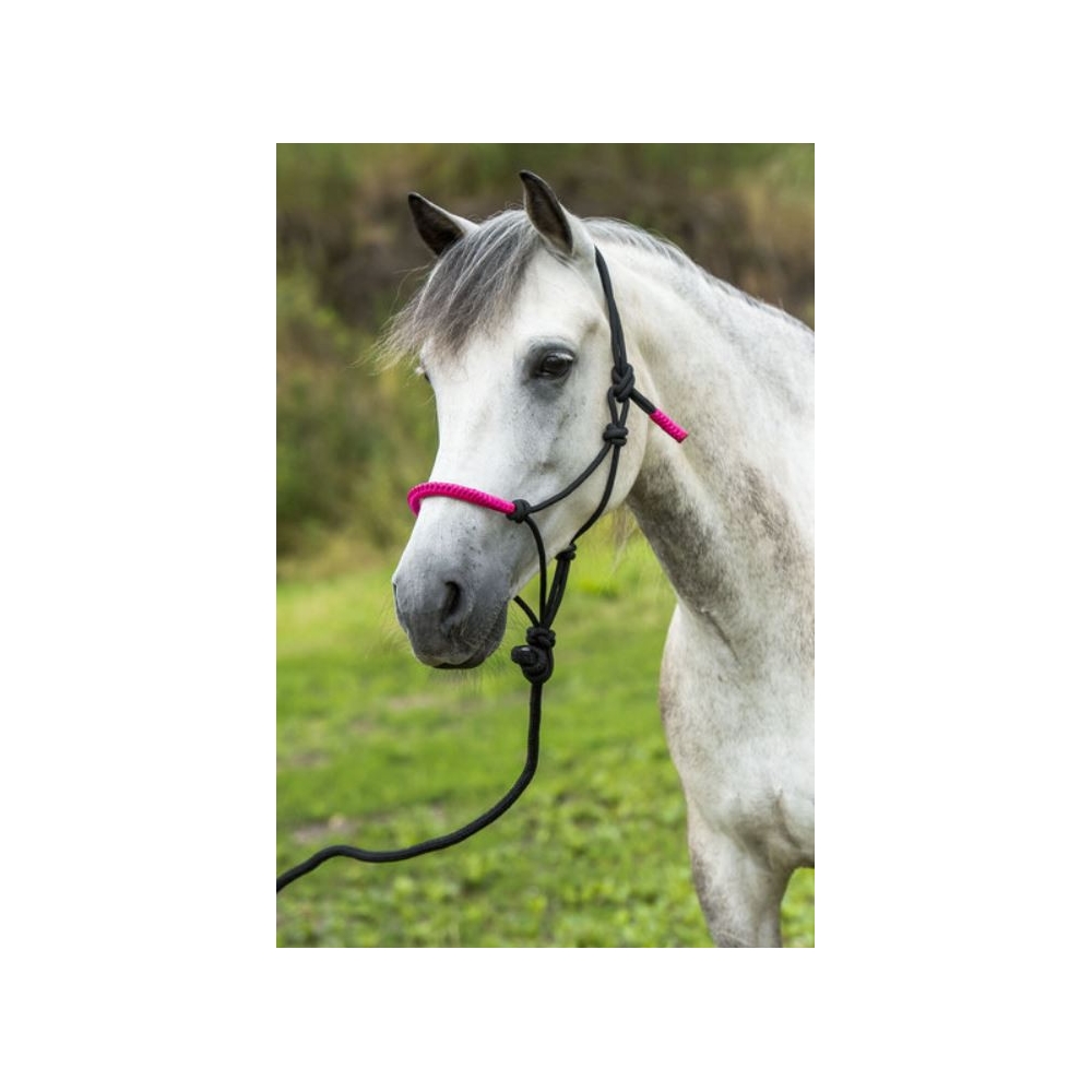 Halfter aus dreifach gelegtem Nylon, verstellbare Nacken- und Nasenriemen mit schwarzem Büffelspaltleder unterlegt. Goldfarbene Beschläge. Mit amerikanischem Anbindestrick 2,50 m lang.