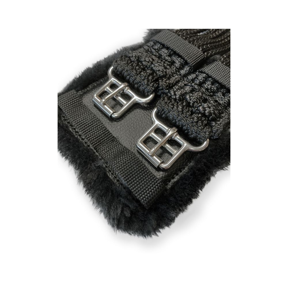 Die Unterfütterung der Schnallen, Polster aus Fleece und Kunstleder, die an den Gurt genäht sind, verhindern Reibung auf der Haut und verhindern, dass sich Haare in den Schnallen verfangen.