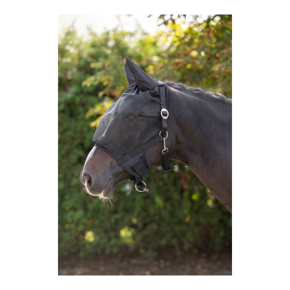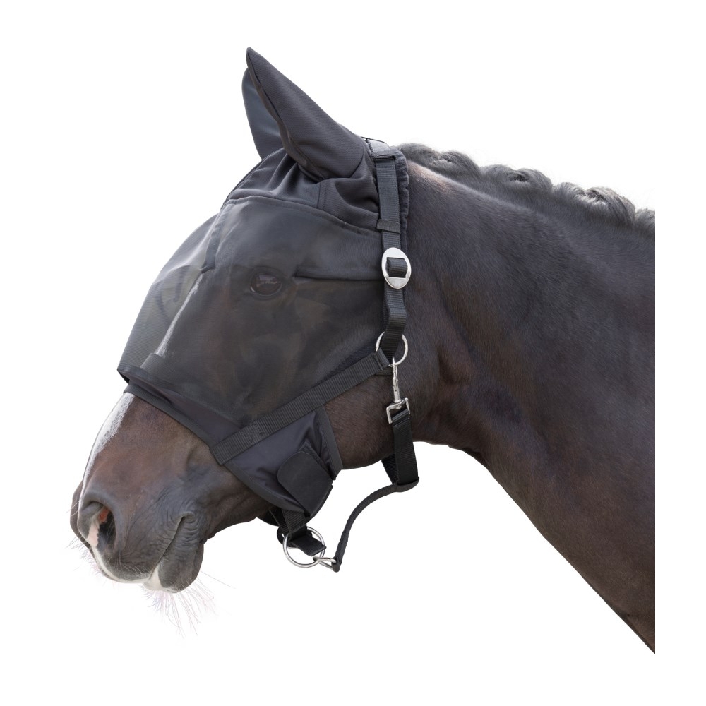 Das Halfter mit integrierter Fliegenmaske passt sich dank eines dehnbaren Lycra-Einsatzes mit Klettverschluss an der Nase perfekt an den Kopf jedes Pferdes an.