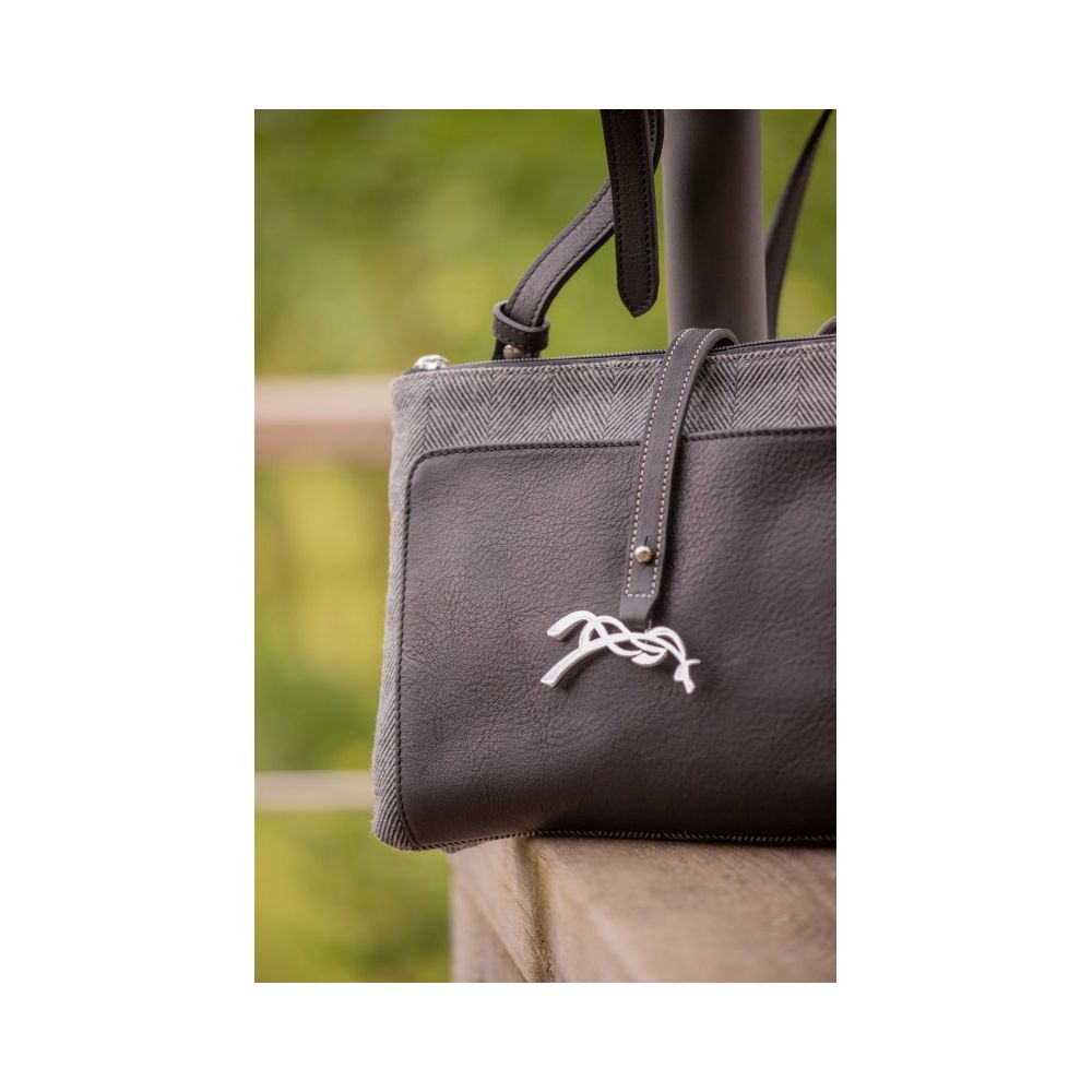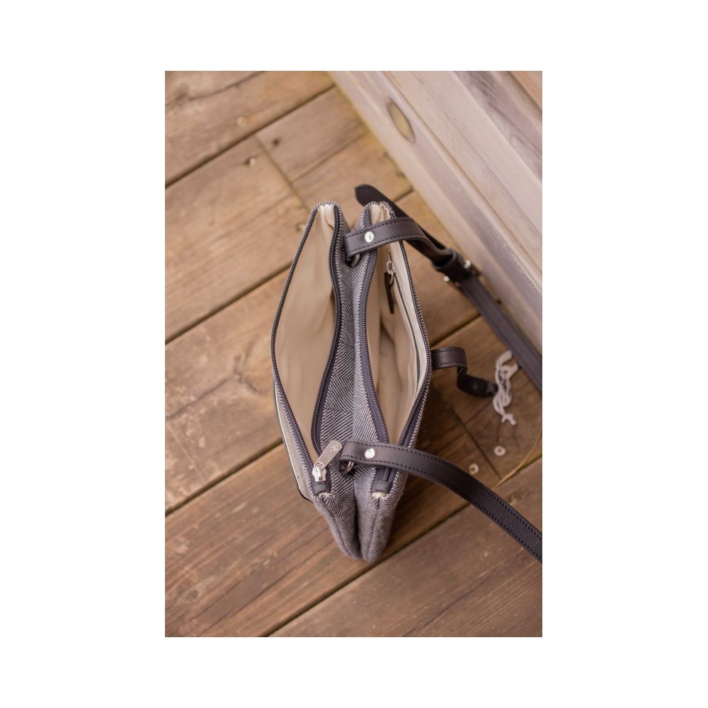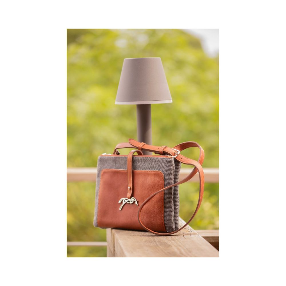 Pablito-Tasche aus Fischgrätenmuster und Leder mit verstellbarem Schulterriemen, der das Tragen über der Schulter ermöglicht. Ein schmaler Lederriemen mit silbernem Penelope-Logo hält zwei Fächer mit Reißverschluss. Das Ganze ist aus einem dicken grauen Fischgratgewebe gefertigt, das mit einem sehr schönen cognacfarbenen Leder gemischt ist.