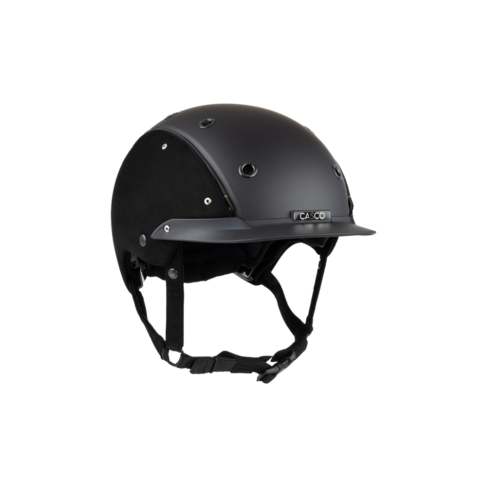 Die elegante Kombination aus mattschwarzer Helmschale und Seiteneinsätzen aus schwarzem Feinvelours-Nubukleder verleiht dem Helm ein besonders hochwertiges Aussehen, ideal für stilbewusste Reiter.