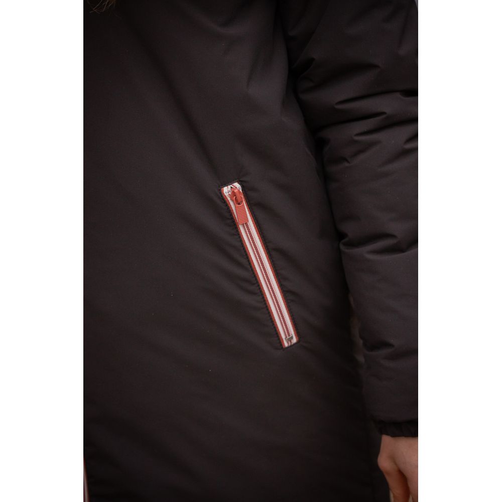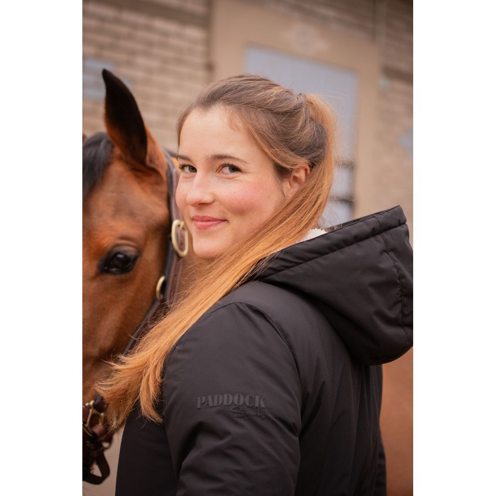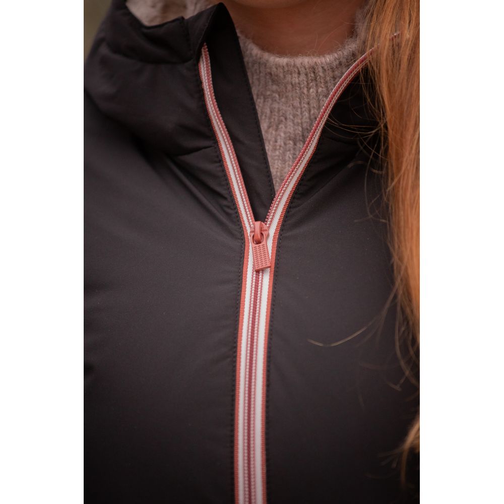 Schwarzer, winddichter, mit Fleece gefütterter, halblanger Parka mit Paddock-Logo aus Gummi auf dem linken Arm. Er wird mit einem großen Reißverschluss auf der Vorderseite geschlossen, der zweifarbig in Weiß und Himbeere gehalten ist.