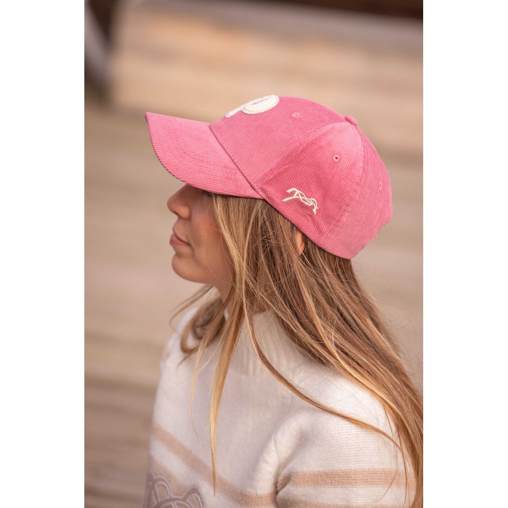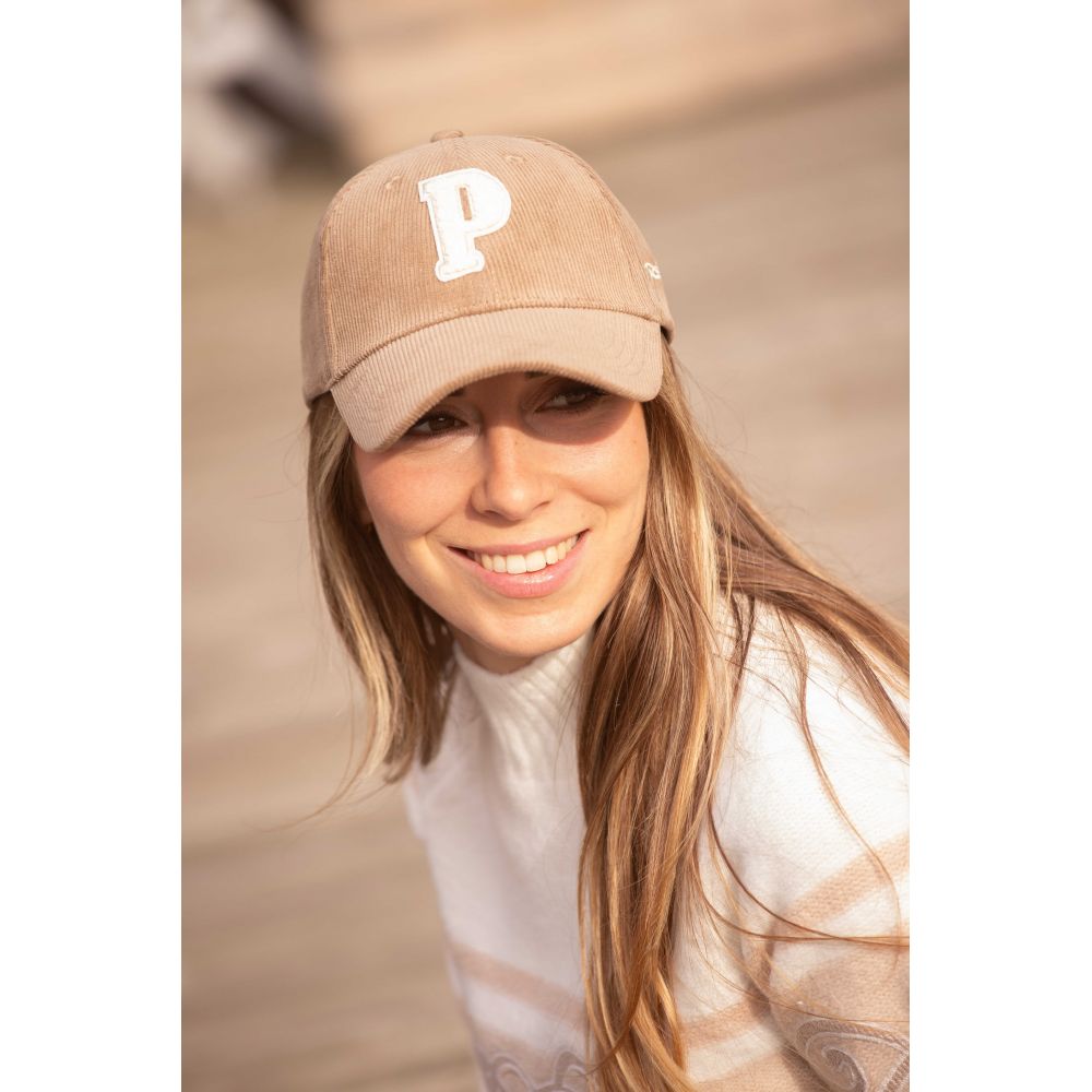 Pénélope Collections Cord-Cap "Suzanna", auf der vorne ein P aus off white Bouclé und auf der linken Seite das Pénélope-Logo zu sehen ist. Die Taille ist hinten verstellbar und passt sich jeder Kopfgröße an.