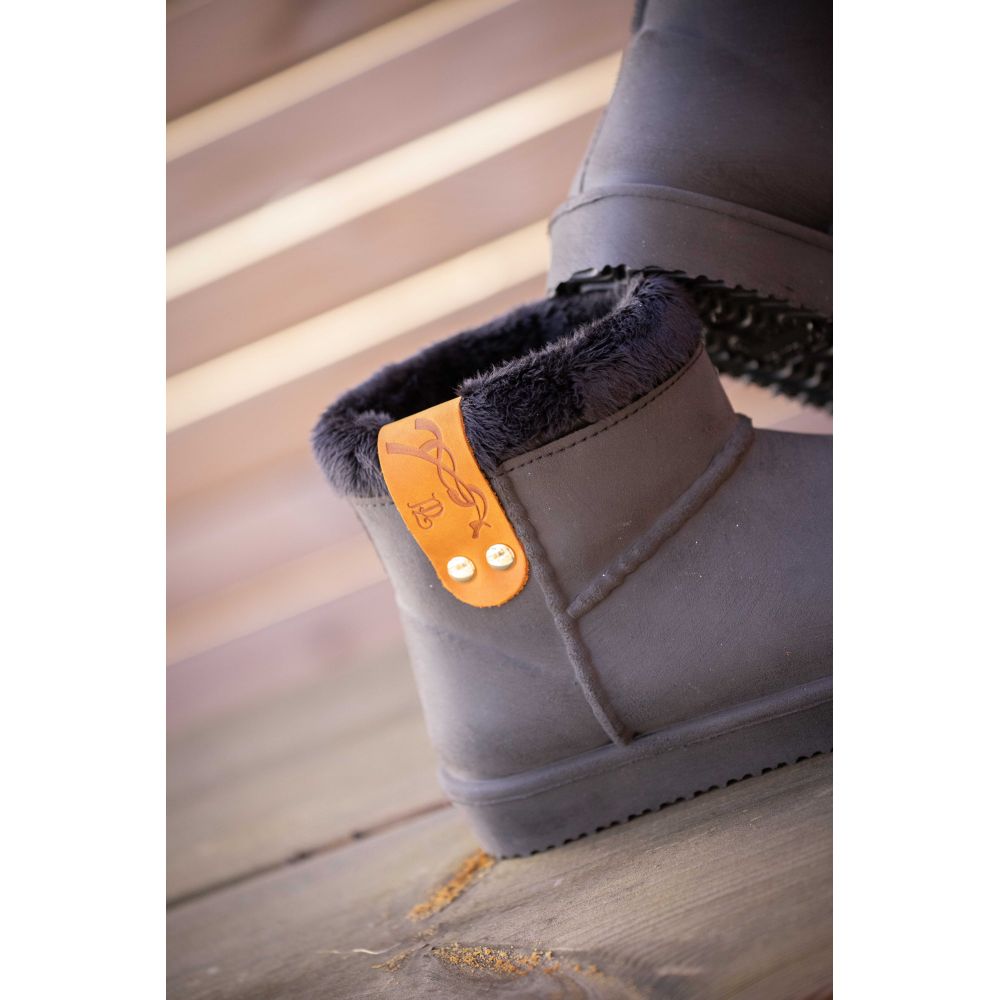 Die Innenseite besteht aus sehr weichem Kunstpelz, der den Füßen Wärme spendet. Außen ist eine Paste aus Kunstleder an der Rückseite der Stiefel angebracht, wo das Penelope-Logo eingestanzt ist.