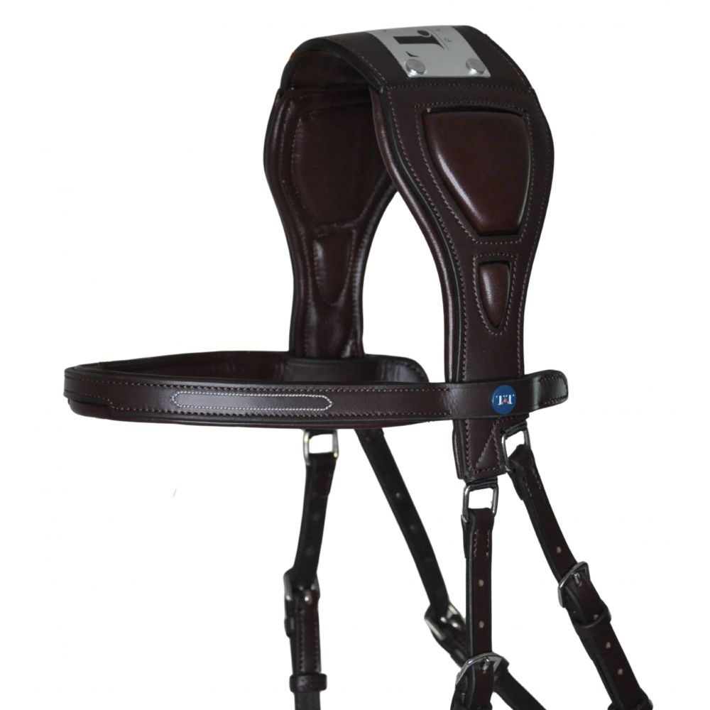 Das Zaumzeug Essentiel à Pont beruht auf einem anatomischen Ansatz für die Verschnallung, bei dem die empfindlichsten Bereiche des Pferdekopfes berücksichtigt werden. Er ist um unser anatomisches Kopfstück mit Brücke herum konzipiert, das patentiert und durch Ultraschall in Tierkliniken bestätigt wurde. Durch die Brücke wird der Druck auf die Halswirbelsäule und das Nuchalband, den strategischen Bereich, der den oberen Teil des Halses mit dem Widerrist verbindet, verringert . Dadurch wird dieser wichtige Stützpunkt der Oberlinie vollständig entlastet, wodurch der Rücken besser einbezogen wird und die Bewegung reibungsloser verläuft. Das besonders breite und mit Memory Foam-Pads gepolsterte Genickstück verteilt und dämpft den Druck optimal.