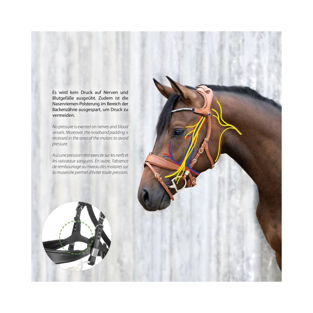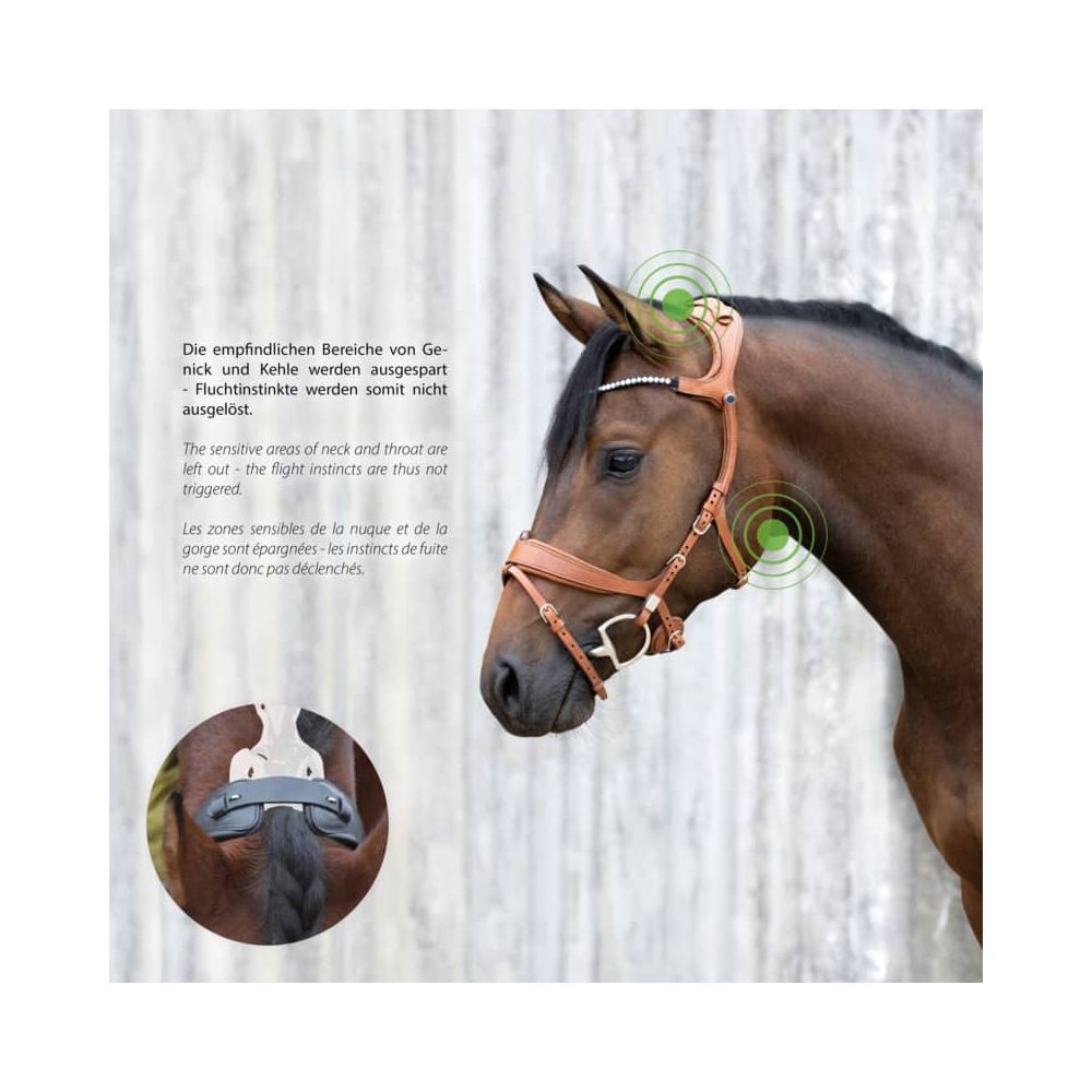 - die Form und die Einstellmöglichkeiten des Kopfstücks sorgen dafür, dass es immer korrekt der Form des Ohransatzes folgt, unabhängig von der Morphologie des Pferdes