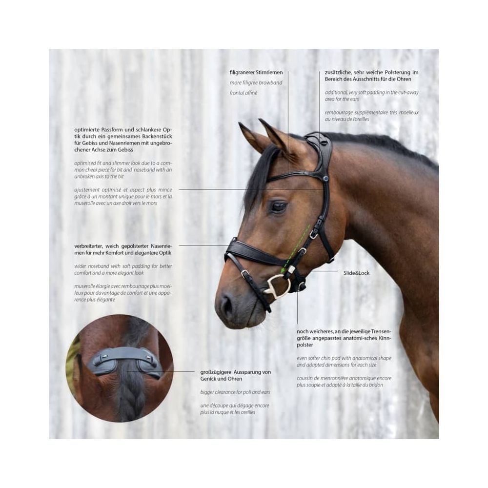 - das Lederstück am hinteren Ende des Nasenriemens, der Kinnriemen, wurde verbessert: Die Polsterung ist weicher und seine Form entspricht besser der Anatomie des Pferdes, wobei für jede Größe unterschiedliche und angepasste Größen zur Verfügung stehen
