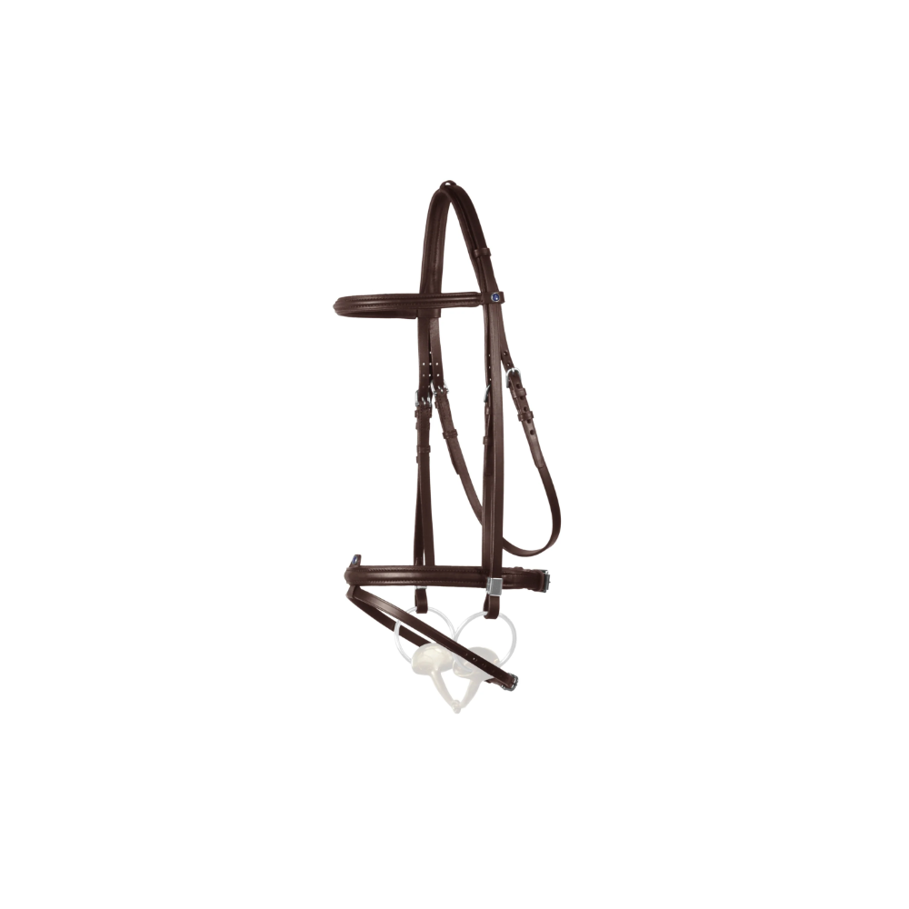 Die Streben des Gebisses werden mit Hilfe von Lederschnallen über das Genickstück geführt. Dadurch können sie frei gleiten, was eine präzise und vollkommen symmetrische Anpassung des Gebisses ermöglicht.
