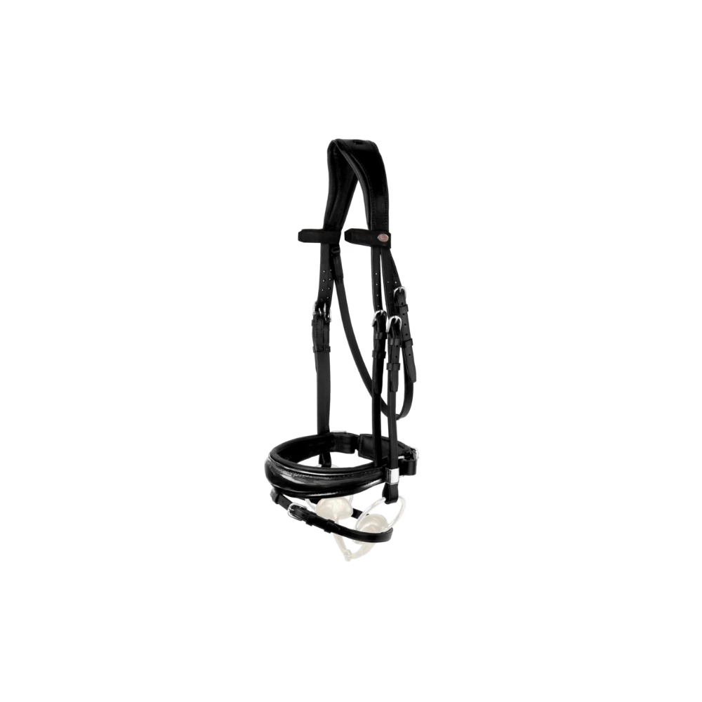 Kombiniertes Reithalfter: weich gepolstert, mit abnehmbarem Nasenband (RFS - Removable Flash System) und Verschlüssen auf beiden Seiten.