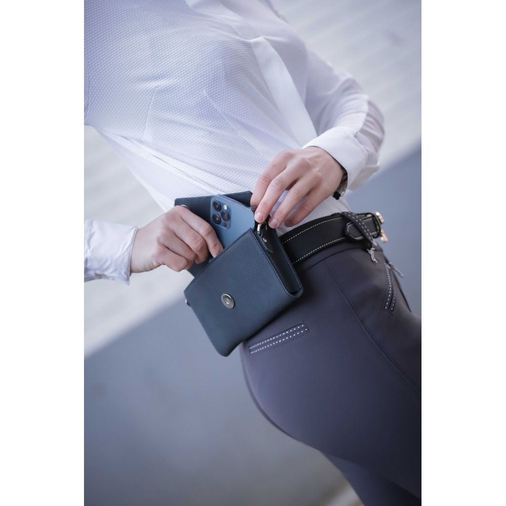 El Phone pocket versión 2023 está confeccionado en piel negra perforada y se fija al cinturón mediante dos trabillas que se cierran con dos automáticos.