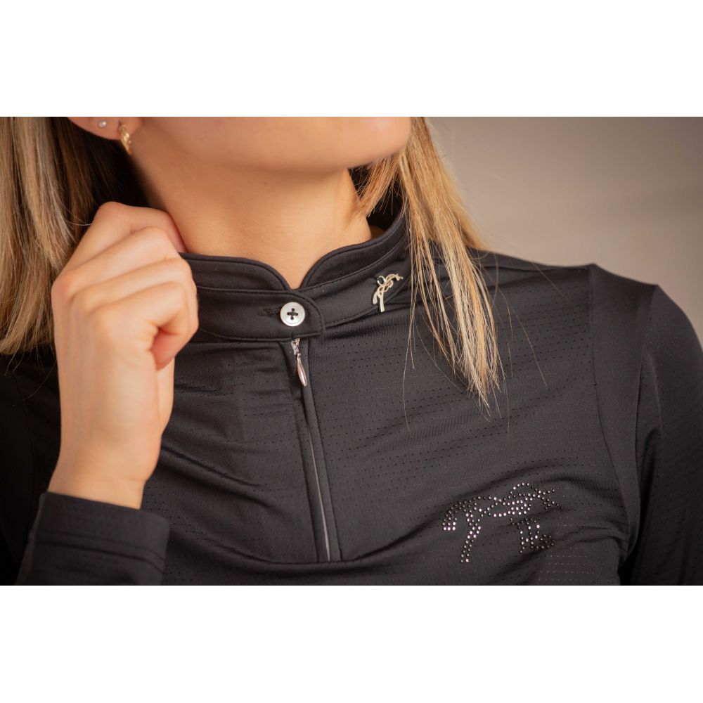 Polo de equitación Techpy de las colecciones Pénélope, de manga larga, para llevar ceñido al cuerpo porque está confeccionado con un tejido ultra elástico y muy cómodo. Este tejido técnico hace que la equitación y otros deportes sean extremadamente cómodos. Es perfecta para entrenar, y se puede llevar sola cuando hace buen tiempo o como capa cuando hace frío. Tiene un pequeño cuello alto que se cierra con una discreta cremallera. Su aspecto recuerda al de un polo de competición, pero esta vez sin cuello blanco, sino con un elegante cuello negro tono sobre tono. En las sisas se aprecian dos inserciones strech que aumentan la comodidad de esta prenda.