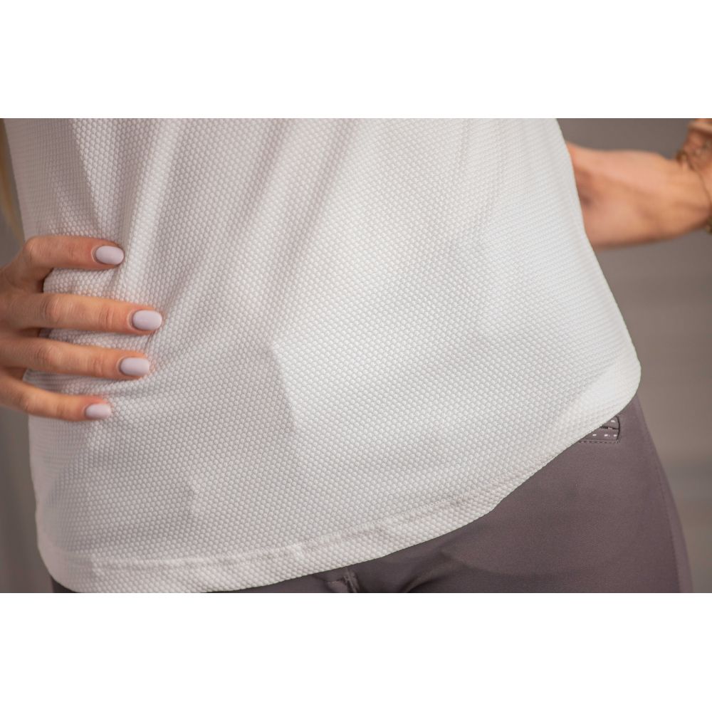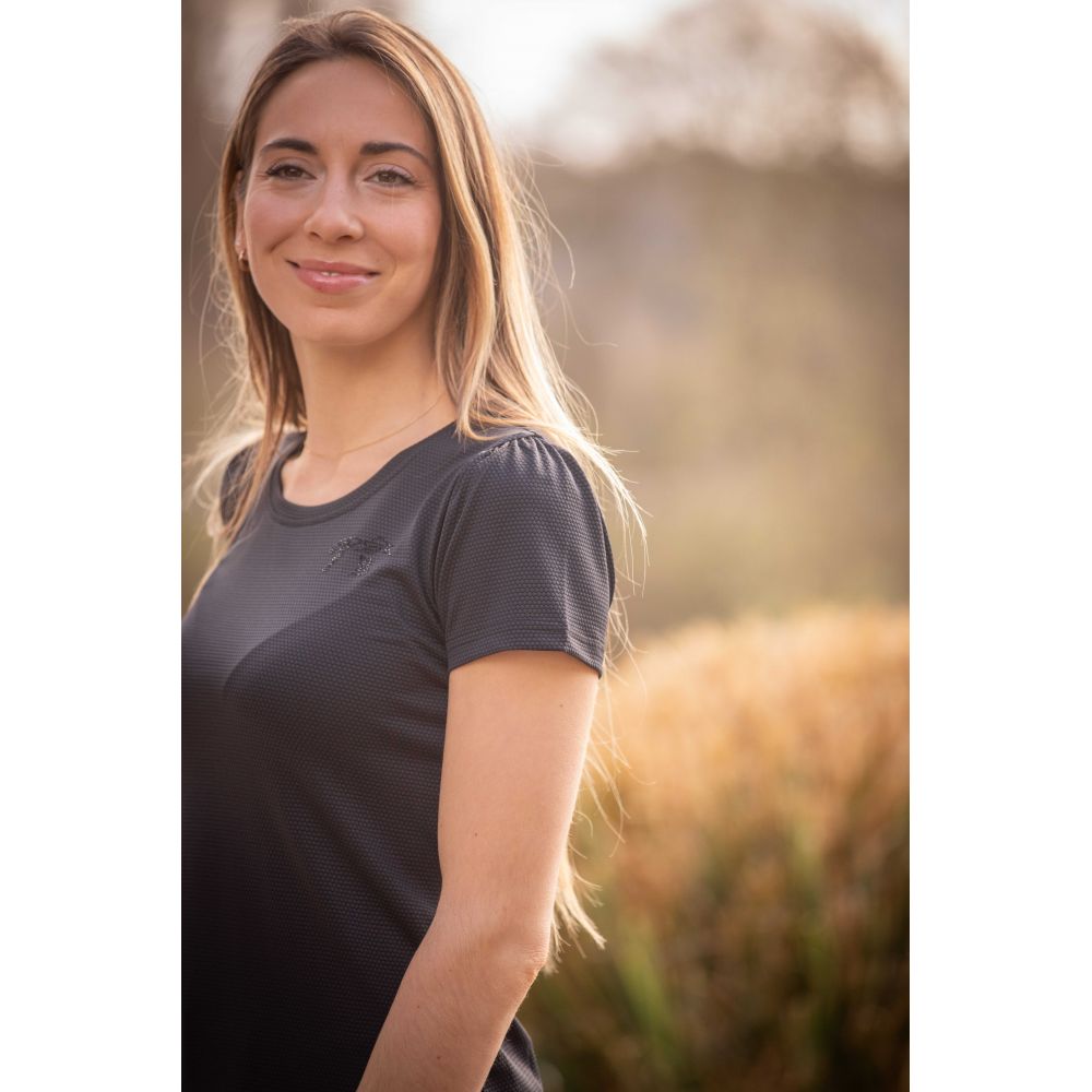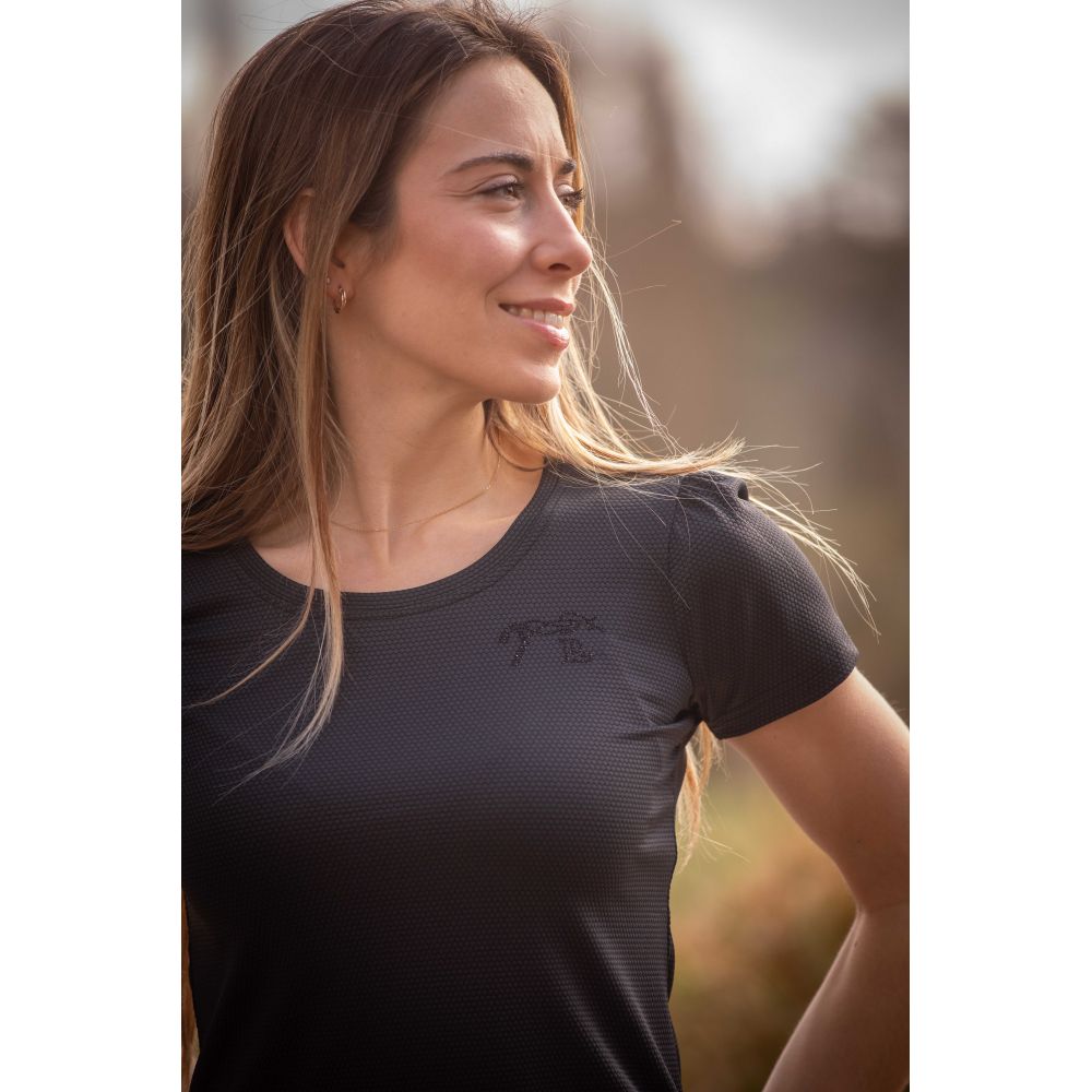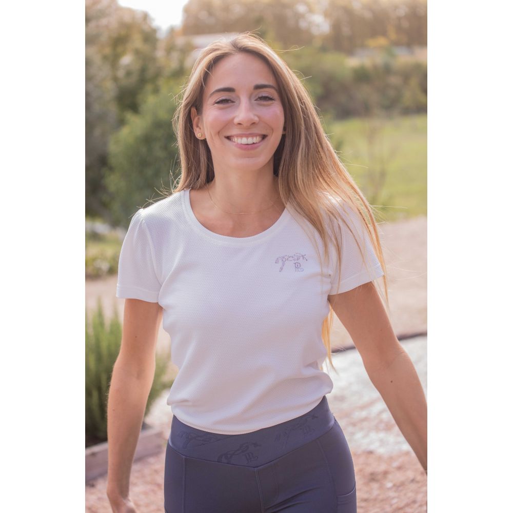 Camiseta técnica PENELOPE "Techty Honey" de tejido microaireado transpirable, ultraligero y ligeramente gofrado, especialmente concebida para la equitación y otros deportes. Tiene mangas cortas con un pequeño pliegue y un logotipo de strass en el corazón.