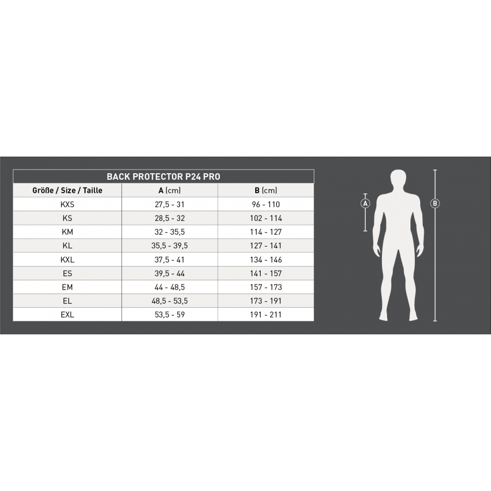 Tabla de tallas en las fotosDesarrollado según la norma de seguridad vigente (EN 1621-2:2014, nivel 2), el equipamiento P24 Pro de SWING ofrece una protección inigualable para los pilotos en acción.