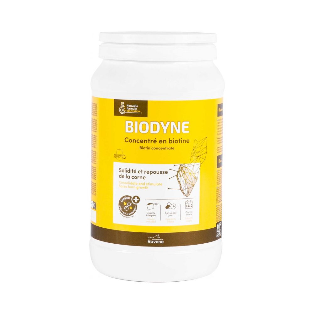 Por lo tanto, es vital ayudar a su caballo a combatir estas tensiones mediante el mantenimiento regular de sus pies. BIODYNE es un producto nutricional con efecto a largo plazo que aporta todos los elementos necesarios para unos cascos sanos. Formulado por nuestros veterinarios, BIODYNE contiene D-Biotina, Metionina, Zinc y Cobre para favorecer el crecimiento de los cuernos y asegurar la fortaleza de los cascos. BIODYNE aporta 20 mg de Biotina pura al día, suficiente para proteger eficazmente el casco. Los elementos contenidos en BIODYNE mantienen la salud y la belleza de las crines y garantizan que el pelaje de su caballo se mantenga brillante.