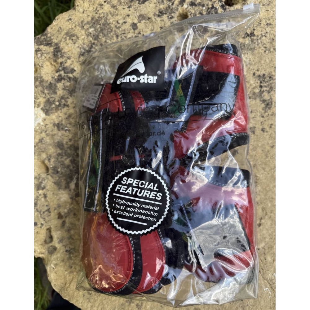 Las polainas se abrochan con resistentes cierres de velcro, lo que garantiza un ajuste estable sin forzar indebidamente al caballo. El discreto logotipo "Euro Star" está colocado en la carcasa y en la banda de sujeción para un acabado sobrio y elegante. El conjunto se compone de polainas + protectores de menudillos para una protección completa de las extremidades.