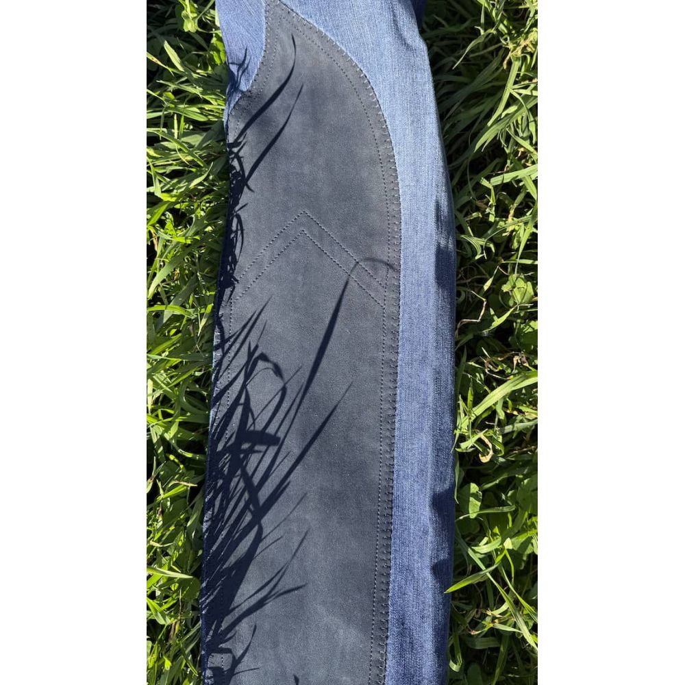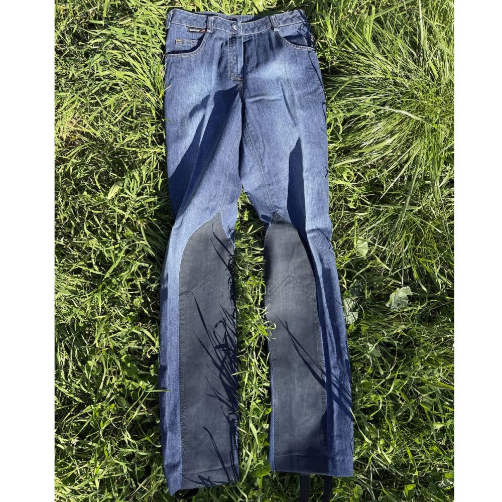 Pantalón vaquero de equitación para mujer con corte jodhpur y refuerzo integral de piel sintética. A pesar de su tejido vaquero, este pantalón de equitación para mujer es totalmente elástico para un confort óptimo durante la equitación.