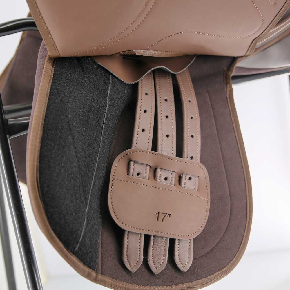 El sillín DMH mixto cuero/sintético combina la estética del cuero con la practicidad del sintético. Presenta una funda sintética símil cuero de color chocolate, realzada por costuras blancas que le confieren un elegante efecto visual. El asiento semi-hueco y acolchado ofrece un buen equilibrio entre comodidad y apoyo, y se adapta tanto a la equitación en llano como al salto.