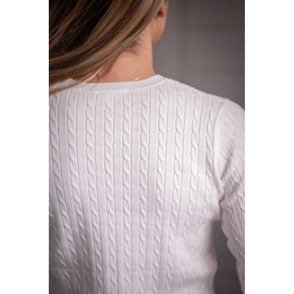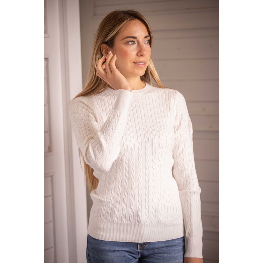 Adorable jersey de punto de canalé. Tiene cuello redondo y se lleva ceñido al cuerpo. El logotipo Pénélope aparece en camel y blanco roto en la parte superior del brazo izquierdo. Un fino ribete de canalé en el bajo del jersey y al final de las mangas añade un plus de comodidad a este jersey, que se lleva igual de bien en la cuadra que en la ciudad.