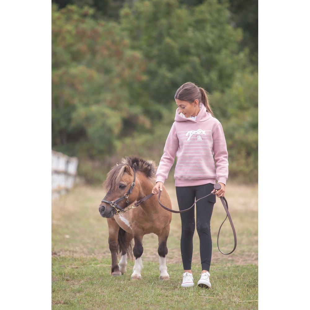 Sudadera con capucha rosa adornada con rayas de purpurina plateada y adornada con el logotipo de Penélope en bouclette blanco roto en la parte delantera.