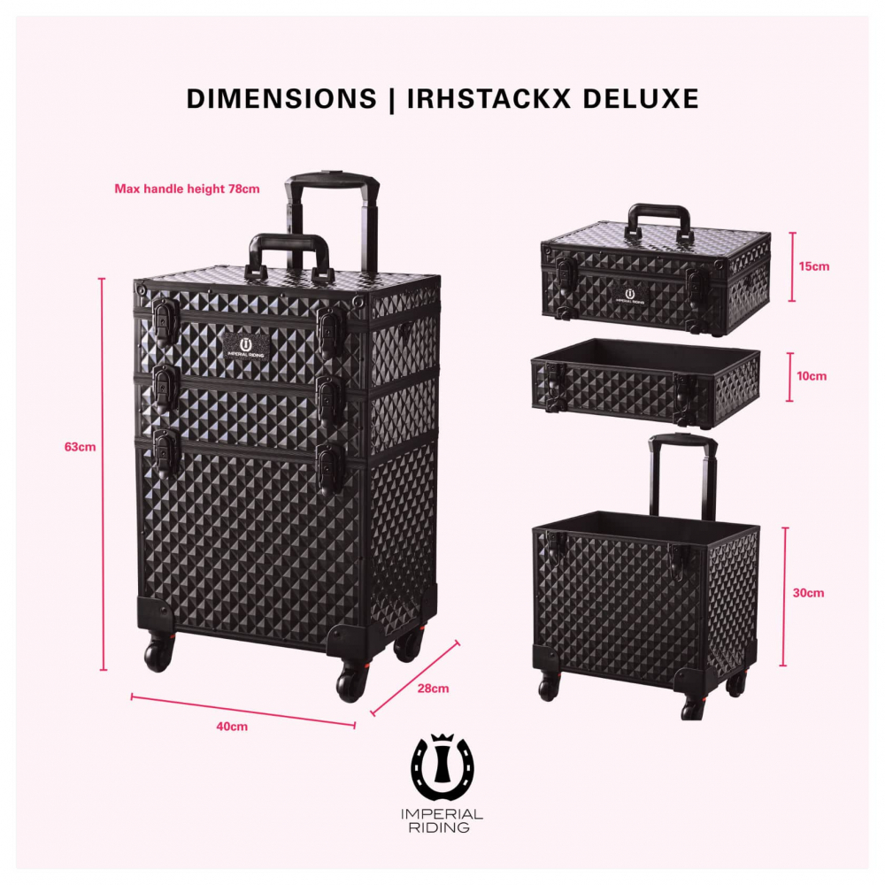 El IRH-StackX Deluxe Grooming Box deImperial Riding es un práctico y elegante box modular diseñado para el jinete moderno. Presenta un diseño apilable -puede ajustar la altura para adaptarla a sus necesidades- y está equipado con ruedas integradas para facilitar su desplazamiento, incluso cuando está cargado. La parte superior puede utilizarse como improvisada montura, ideal para los caballos o para prepararse.