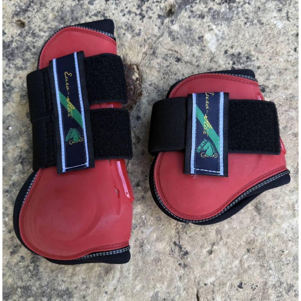 La fixation se fait par scratch robustes, garantissant un ajustement stable sans contrainte excessive pour le cheval. Le logo discret “Euro Star” est placé sur la coque et la bande de fermeture pour une finition sobre et élégante. Le set se compose de guêtres + protège-boulets pour une protection complète des membres.