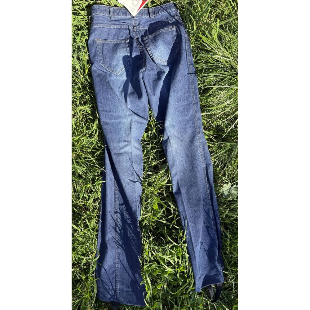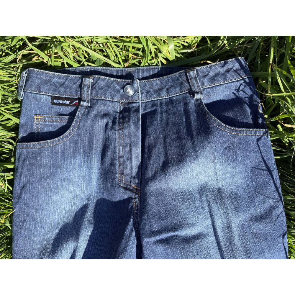 Pantalon d'équitation en jean pour dames, coupe jodhpur et avec renfort intégral en cuir synthétique. Malgré son tissu en jean, ce pantalon d'équitation pour damess est entièrement élastique et offre ainsi un confort optimal lors de la pratique de l'équitation.