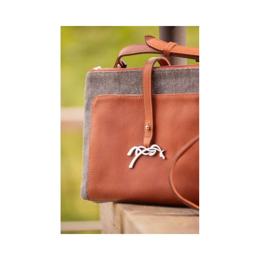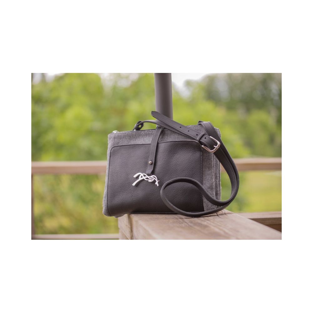 Sac Pablito en tissu chevron et cuir doté d'une bandoulière réglable qui permet un porté à l'épaule. Une fine lanière en cuir rehaussé du logo Pénélope en argent maintient deux compartiments zippés. Le tout est confectionné dans un tissu en chevron gris épais mixé avec un très joli cuir cognac.