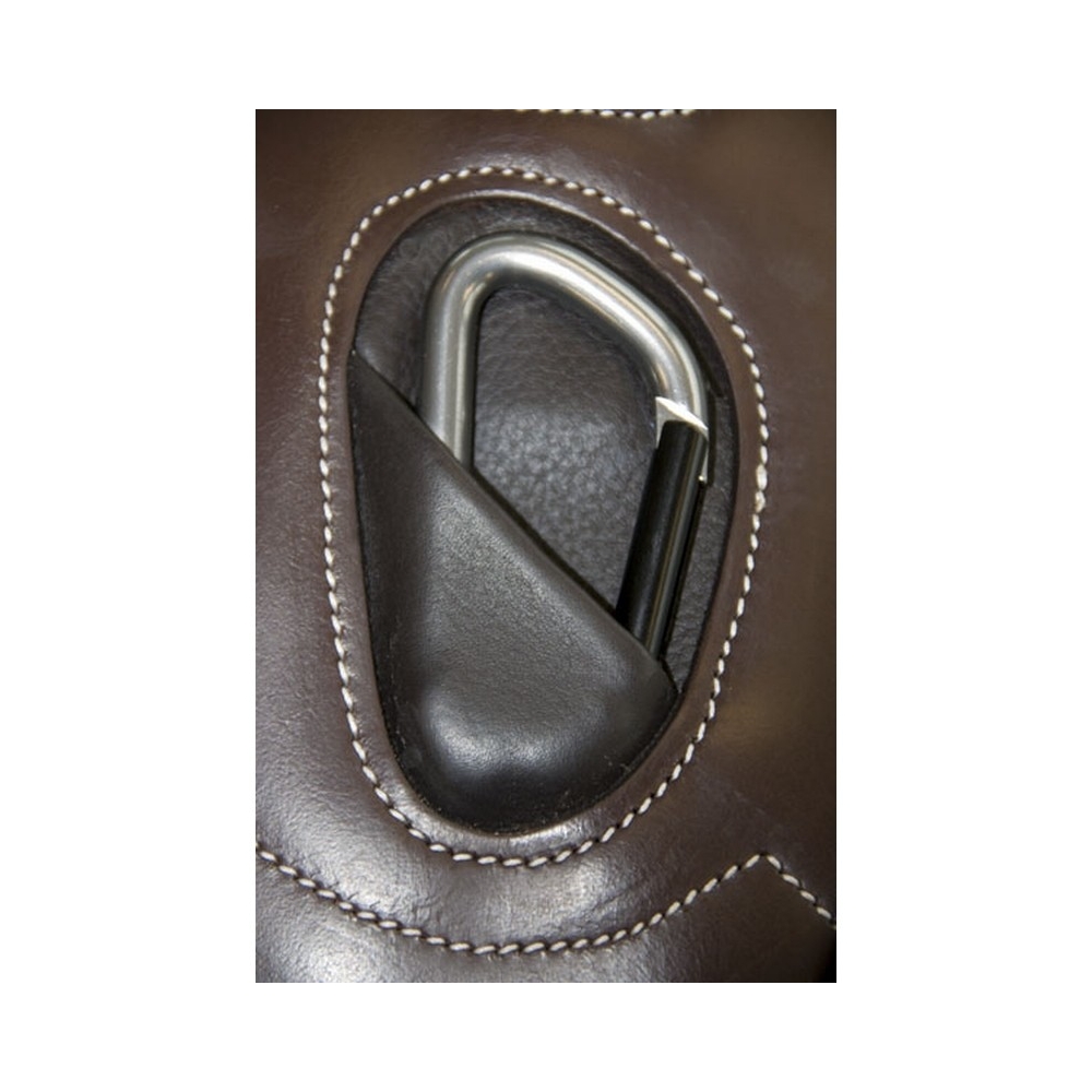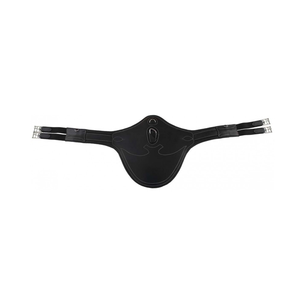 Triple épaisseur d'élastique de chaque côté pour plus de confort et de facilité d'utilisation. Au centre: un dé et un mousqueton recouvert d'une protection en cuir pour fixer vos enrênements boucles à rouleaux pour faciliter le sanglage et protéger les sanglons Cuir resistant et de belles qualite, belle finition en surpiqures blanches.