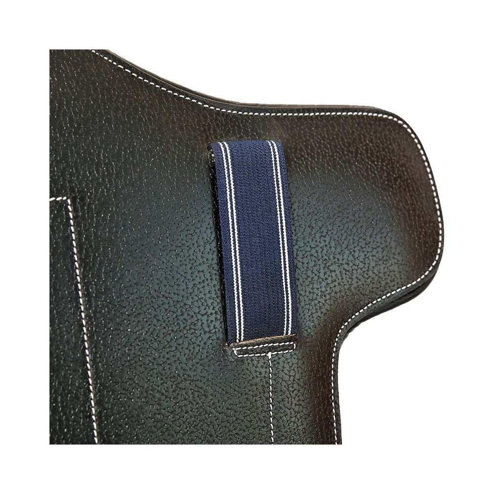 Superbe bavette en cuir de buffle, aspect grainé. Rembourrage confort très épais. Bavette souple surpiqué d'un ton crème. Anneau et élastique de maintien solide.