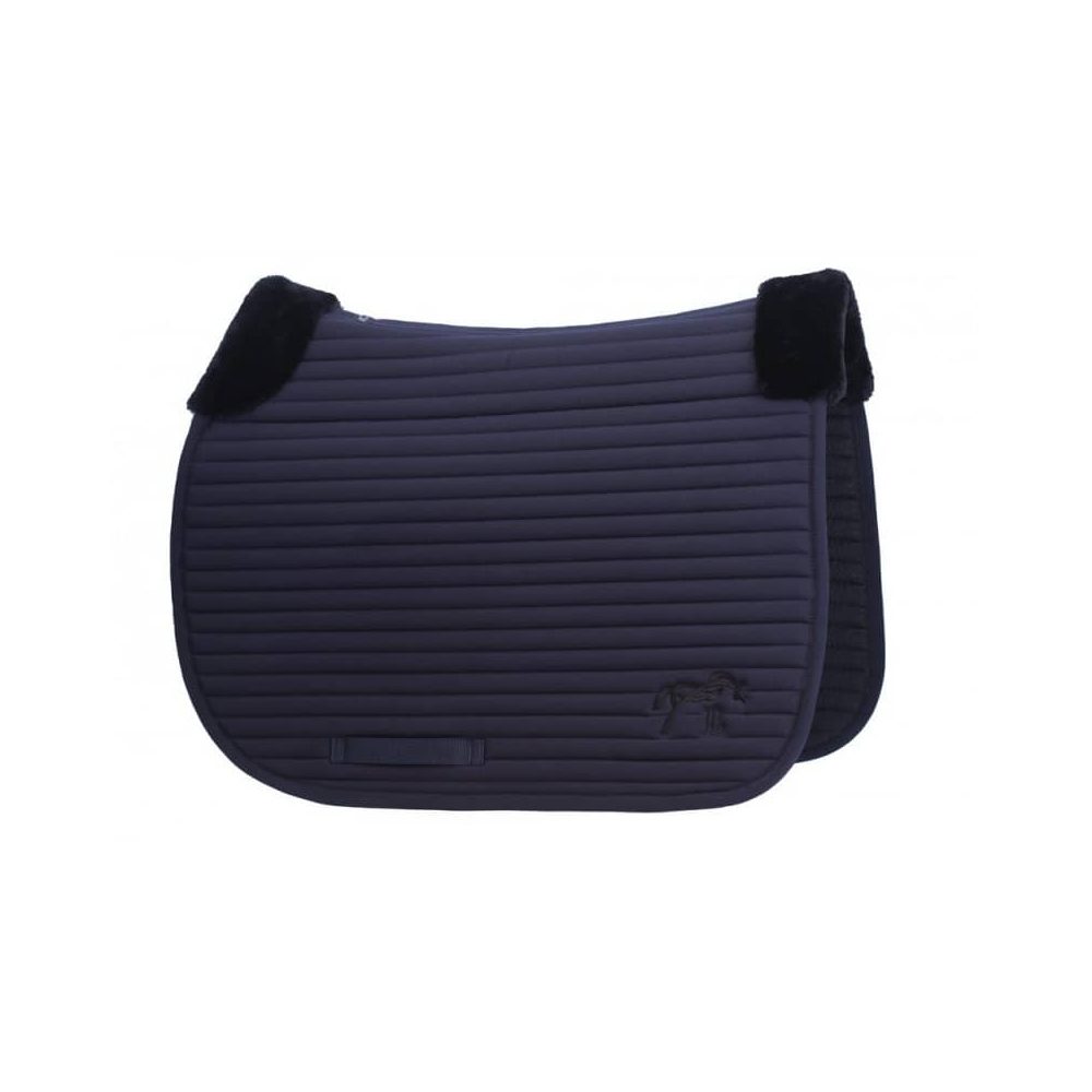 Tapis de selle "Lyona" Pénélope au fin matelassage horizontal, doté d'un renfort en fausse fourrure sous la selle, puis au niveau du garrot et à l'arrière de la selle.