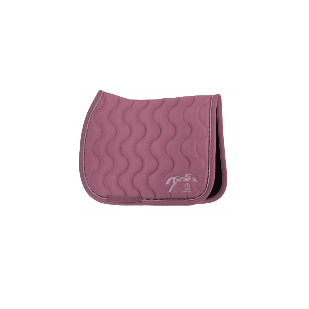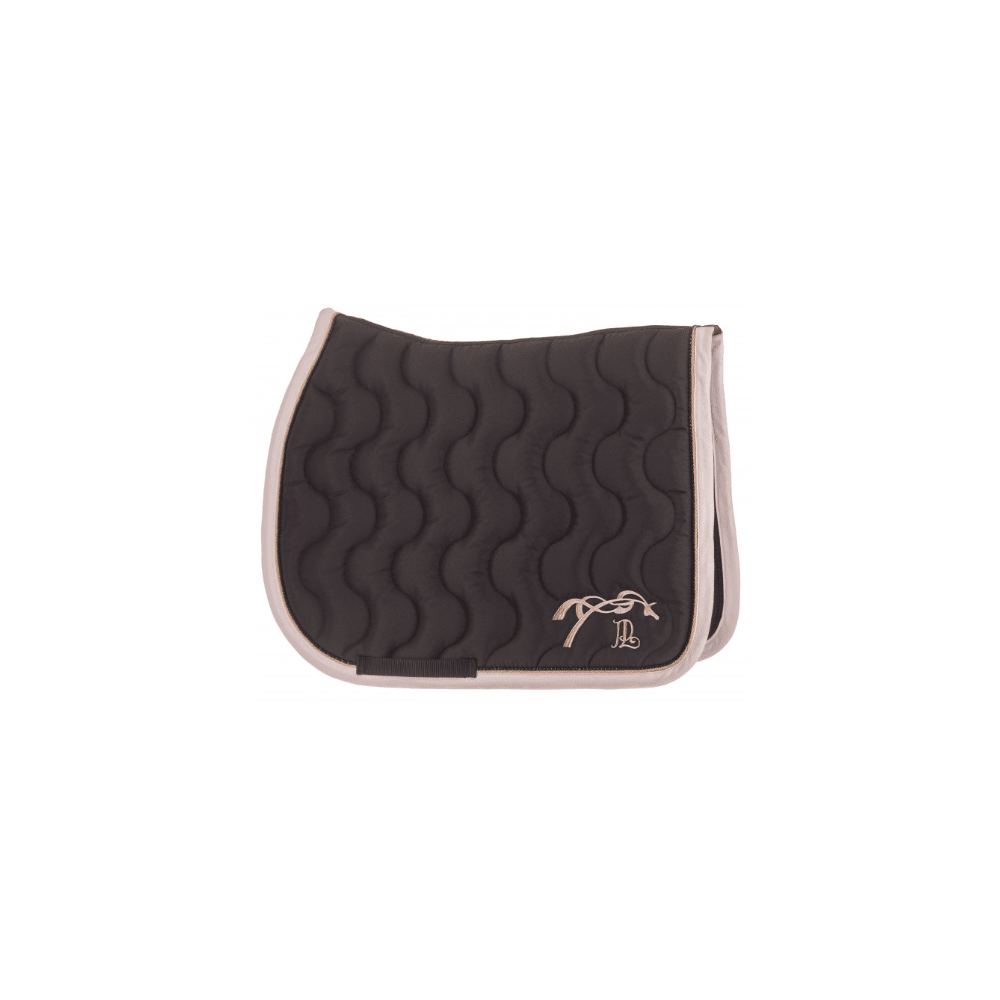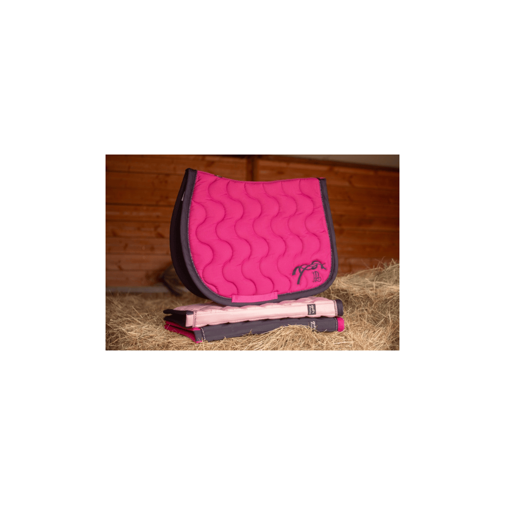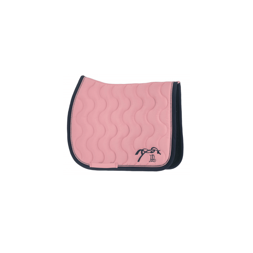 Tapis de selle "Diamant" Pénélope matelassé en vague, galonné d'une fine tresse et orné de strass tout autour. Il a une belle ligne de dos bien dégarroté et une jolie broderie Pénélope à l'arrière des deux cotés. Il est doublé par un tissu nid d'abeille respirant qui absorbe la transpiration du cheval et apporte un maximum de confort.